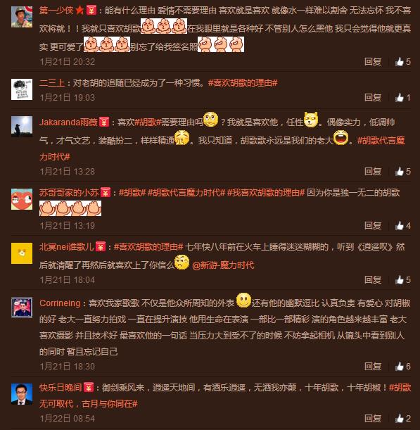 胡歌粉丝在官博留言